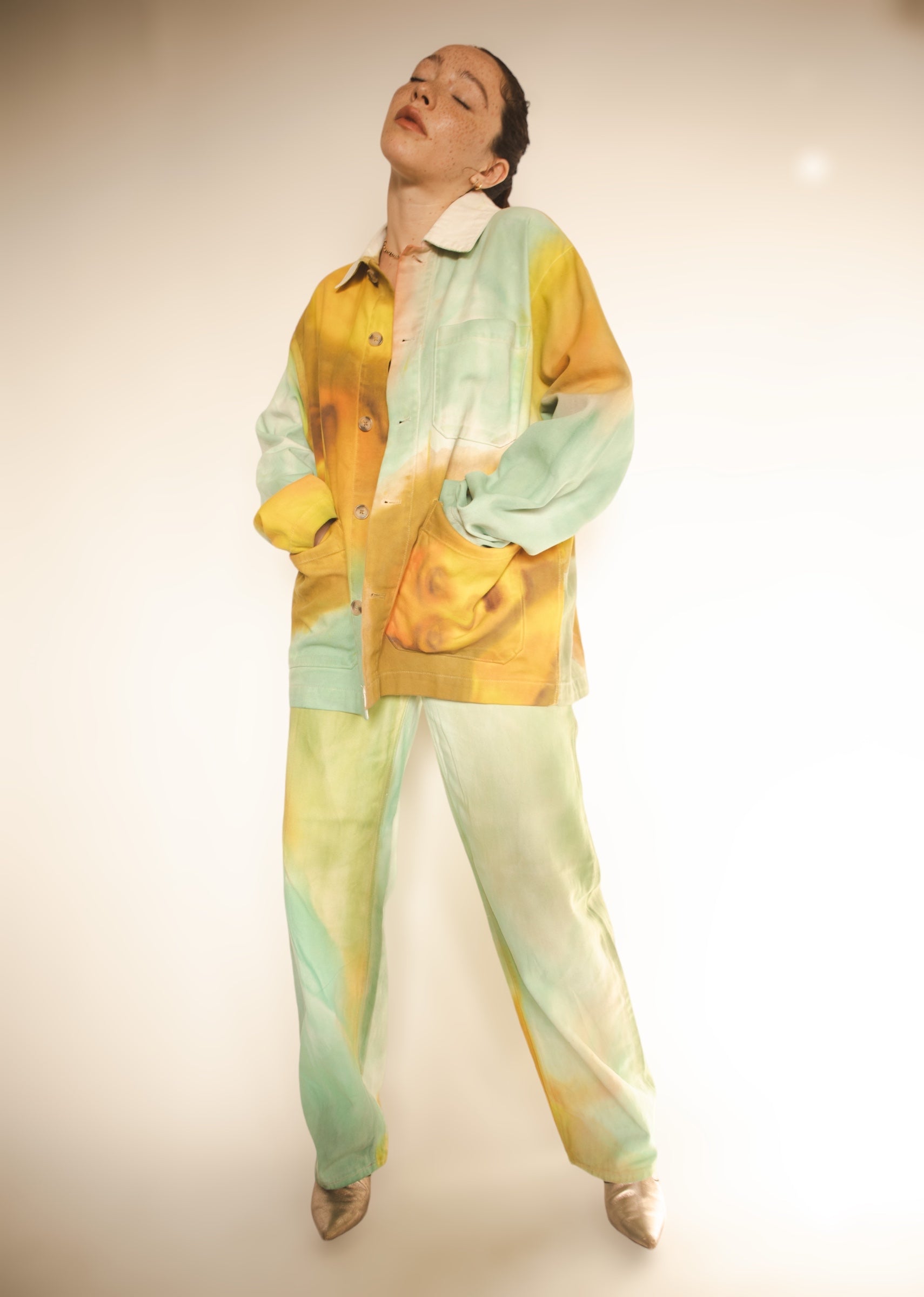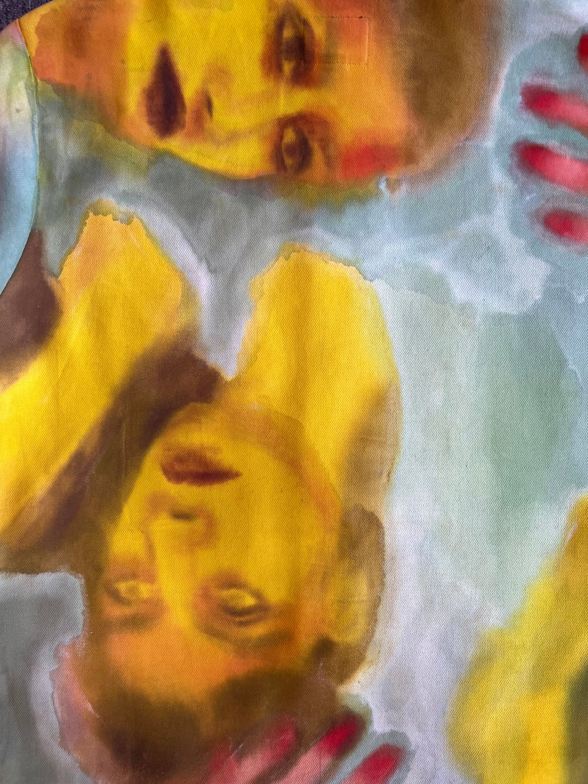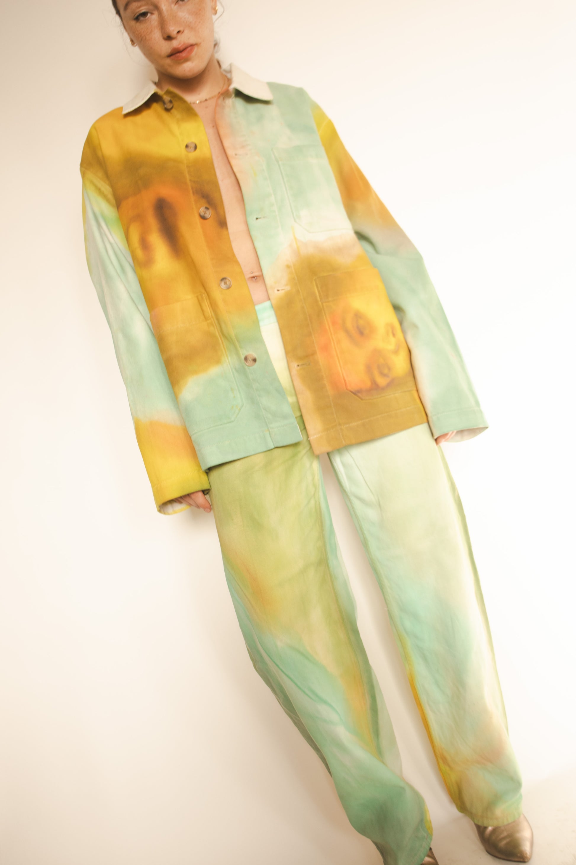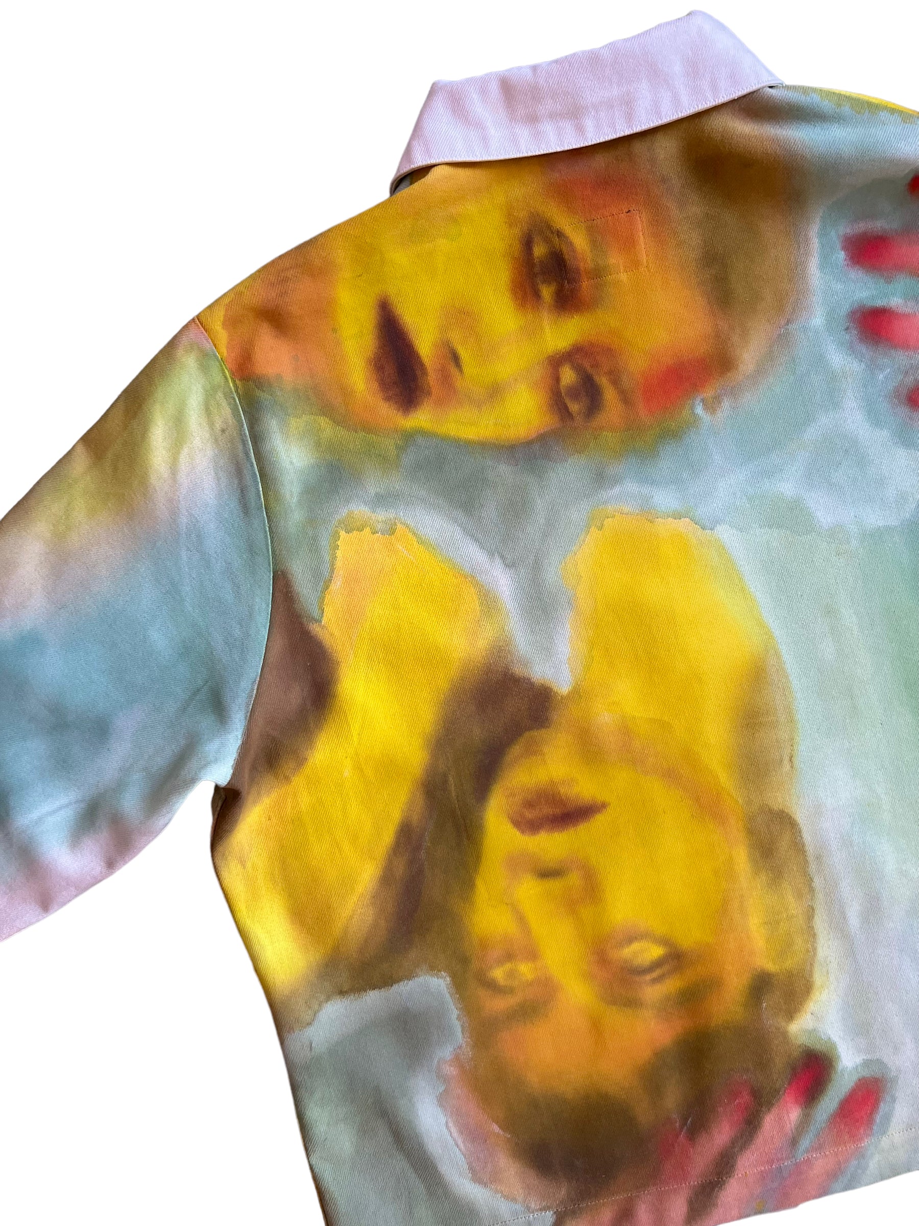 custom, hand-painted chore coat • 100% thick cotton twill • straight cut hem • no lining • men’s size L • sleeve length 25” • shoulder width 21” • back length 28” • machine washable • 1 of 1 • made in New Orleans